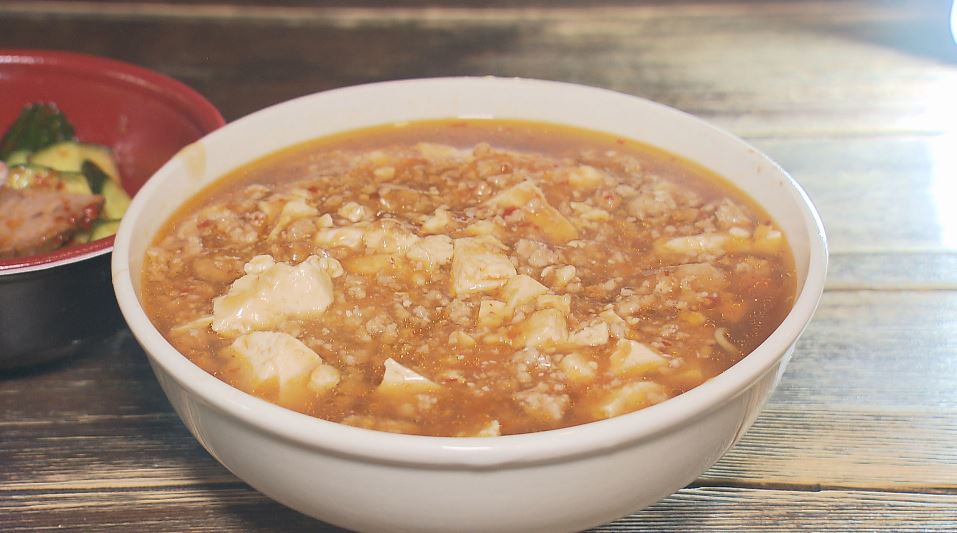 ひき肉に豆腐をたっぷり。ラージャンで炒め、麺の上にかける「トーフラーメン」の完成です。ピリ辛のあんが麺と豆腐に絡みます。