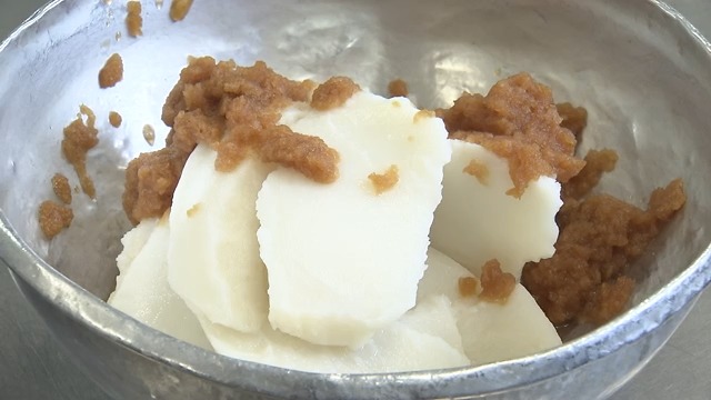 山形村産の長芋は煮た後、裏ごしをするのがポイント。ほかの材料と混ざりやすくなり、焼いた後、しっとりとしてきめが細かくなるそうです。