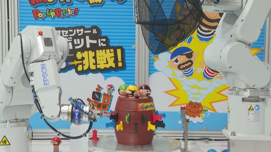 開発したのは長野県諏訪市に本社を置くセイコーエプソン。「黒ひげ危機一発」を使い繊細な力加減や狭い隙間に部品をはめ込むといった難しい作業ができることをPRしています。