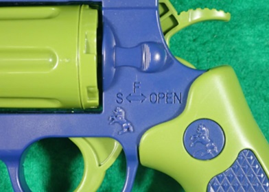 新たに判明した玩具と称した真正拳銃「リアルギミックミニリボルバー」は回転弾倉式拳銃で、「S F OPEN」の刻印があります。