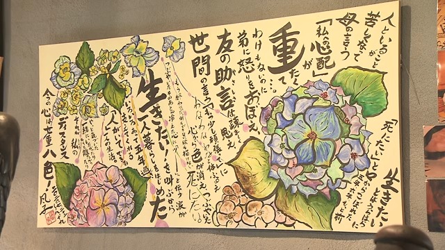 美しく咲き誇る彼岸花と力強く書かれた「魂」の文字、色鮮やかに描かれたアジサイに添えられるたくさんの詩。