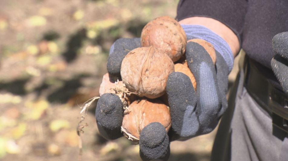 竹ざおで枝をたたいて落ちてきたのは、収穫最盛期を迎えた「クルミ」です。