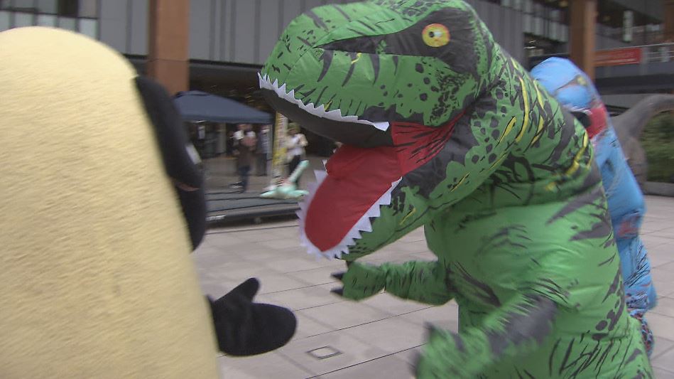 長野駅前で雄たけびをあげる「ラプトル」。恐竜たちの目的は、週末、信州新町で開かれるイベントのPRです。