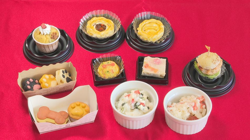 ペットが楽しめるビュッフェメニューです。動物の飼育を学ぶ学生と、菓子作りを学ぶ学生が共同開発した10品が披露されました。さて、犬たちの反応は?