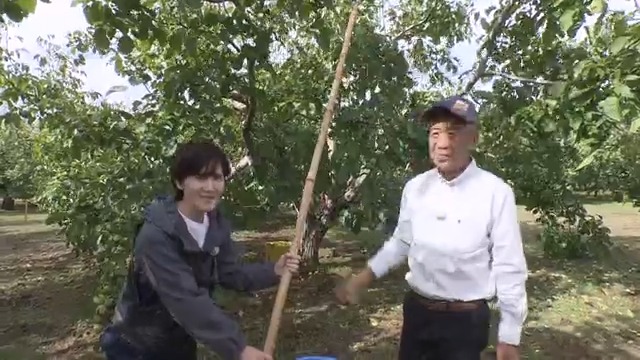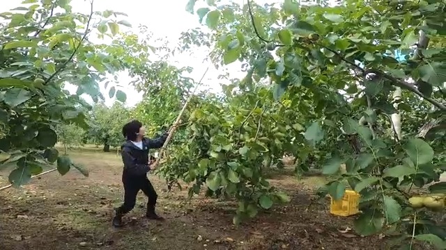 高いところでは5メートルほどの場所にも実をつける「クルミ」。長い竹竿を使う収穫は「重労働」です。