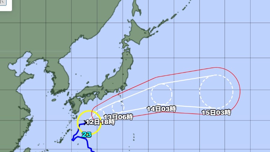 予報円の中心から半径155キロ以内では風速25メートル以上の暴風域に入るおそれがあるということです。
