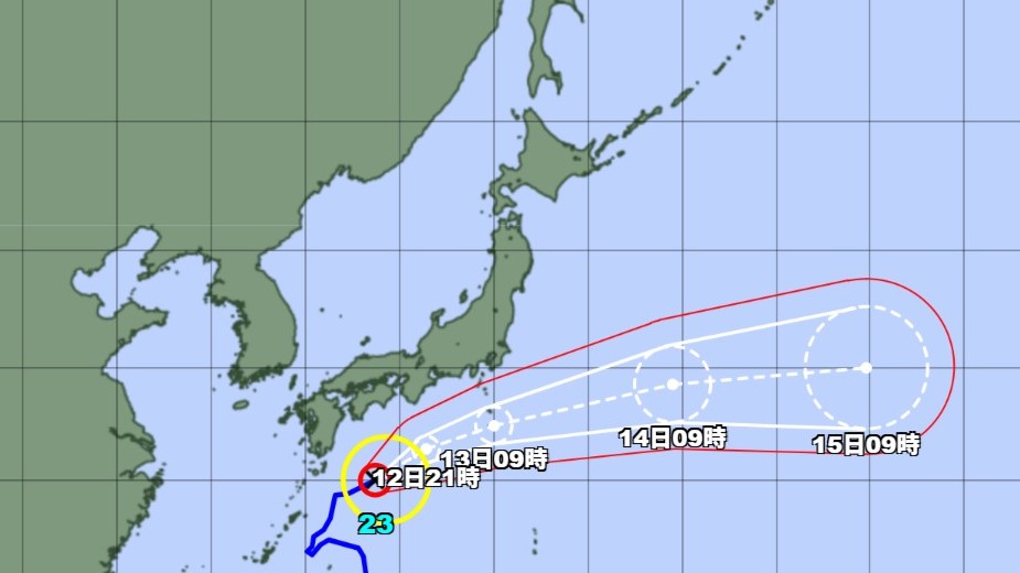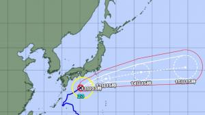 24時間後の13日正午には八丈島の東約130キロの北緯32度55分、東経141度10分を中心とする半径95キロの円内に達する見込みで、中心の気圧は970ヘクトパスカル、中心付近の最大風速は35メートル、最大瞬間風速は50メートルが予想されます。