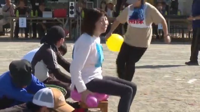 各地区40代以上の男女6人がチームとなり、お尻で風船を割ってつないでいきます。