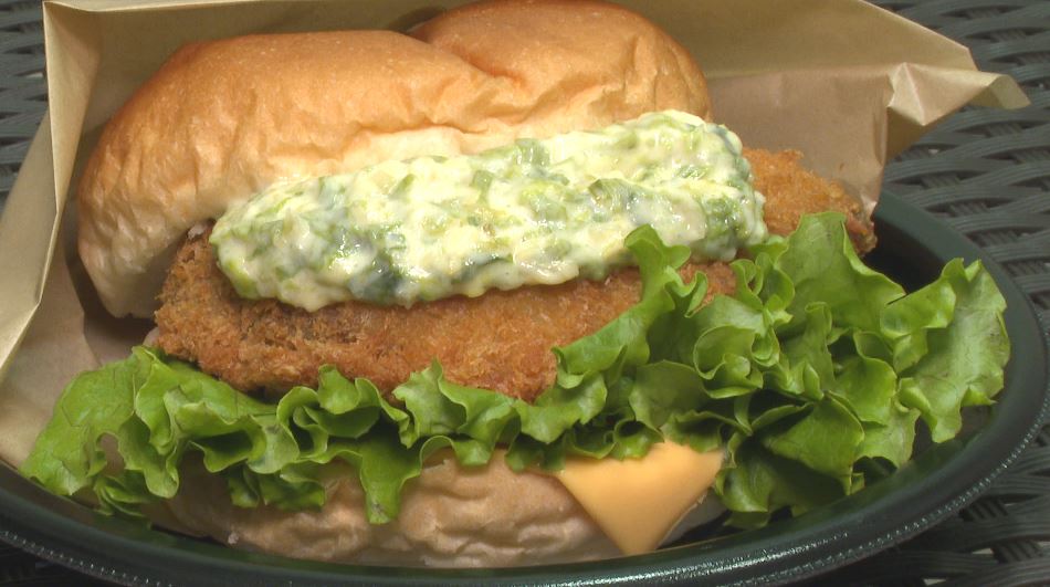 バンズからはみ出るほどの大きなブリカツ、アオサやたくあんを混ぜた和風タルタルソースが特徴。