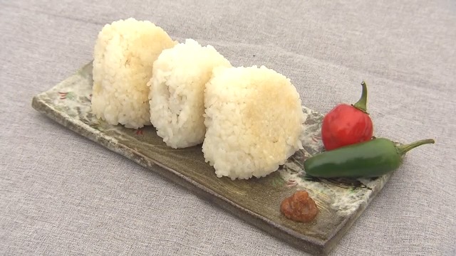 まず1品目は焼きおにぎり。「旨辛味噌」を具に使います。熱したごま油で両面しっかりと焼き目をつければ完成。