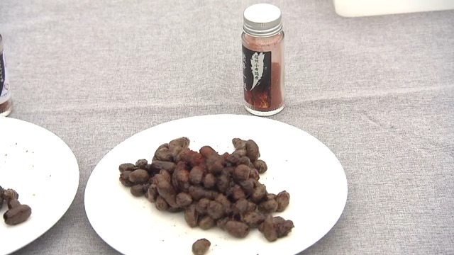 続いては「むかごの甘辛炒め」。サトイモの新芽の部分の「むかご」を油で柔らかくなるまで炒めたら、しょうゆ、みりん、砂糖を加えて味をつけます。水溶き片栗粉でとろみをつけ皿に移したら、仕上げに、それぞれ「ゆず七味」と、「激辛の一味」を振りかければ完成です。