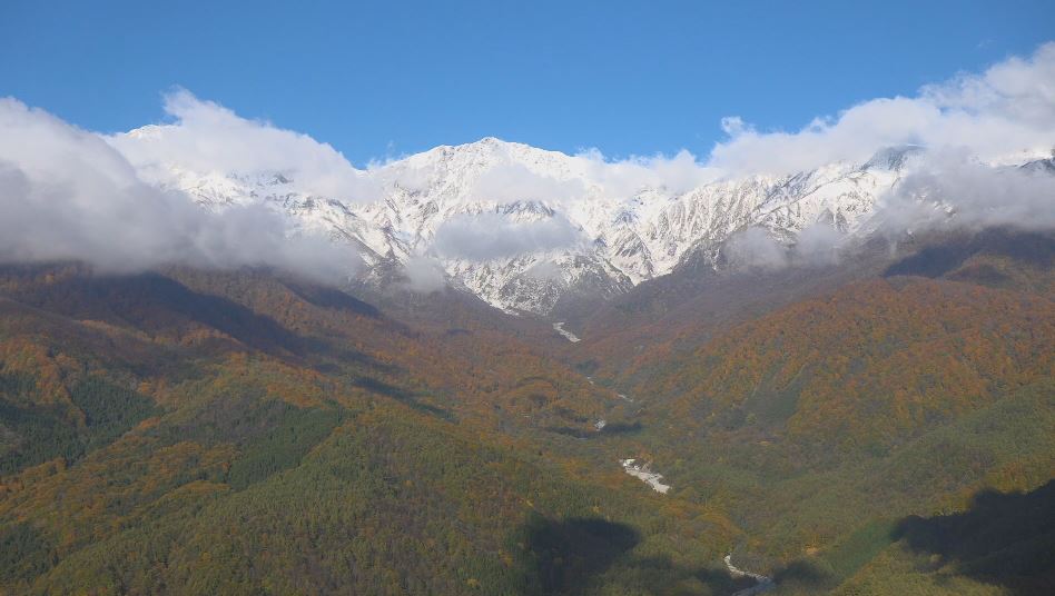 白い雪をかぶった白馬三山と中腹の紅葉、麓の緑の「三段紅葉」を楽しむことが出来ました。