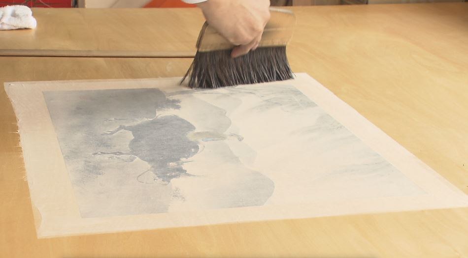 素早い手つきで和紙に均一に「のり」を広げ、水墨画の裏側にまっすぐ、皺なく、貼り付けます。