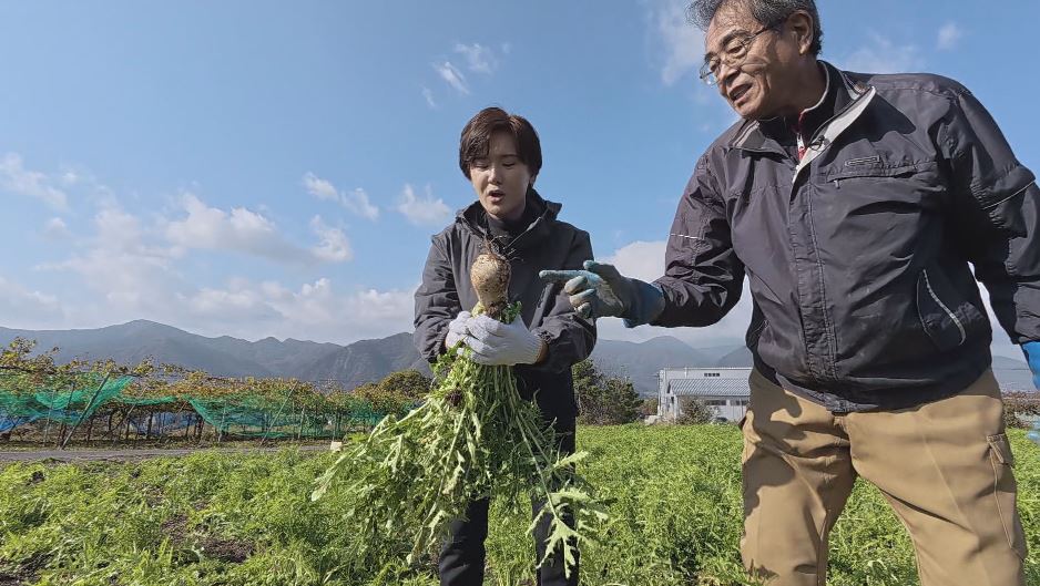 さて、最盛期を迎えた「ねずみ大根」の収穫を体験しようと岸本気象予報士が「あいさい」が管理する畑へ。