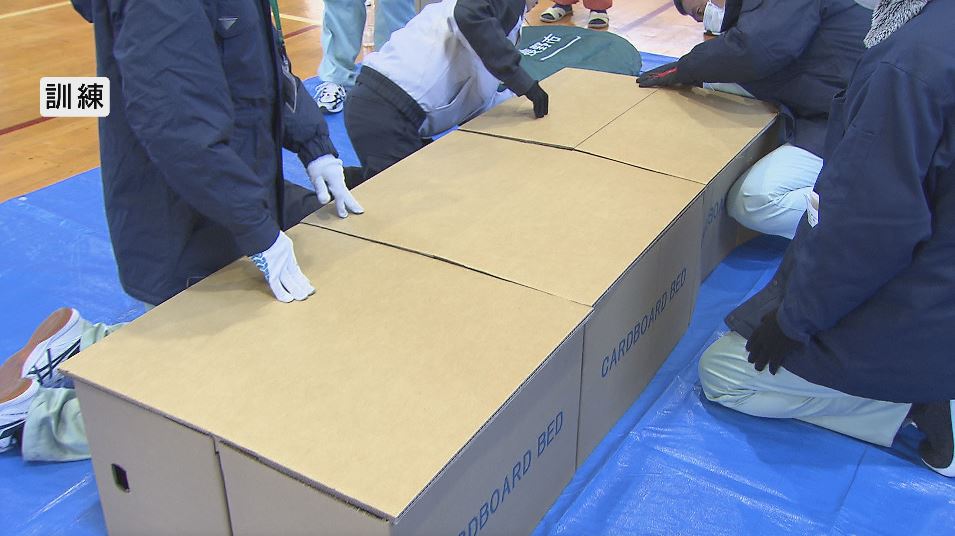 訓練には職員およそ40人が参加し、簡易トイレやテント、段ボールベッドなどを組み立て設置する手順も確認しました。