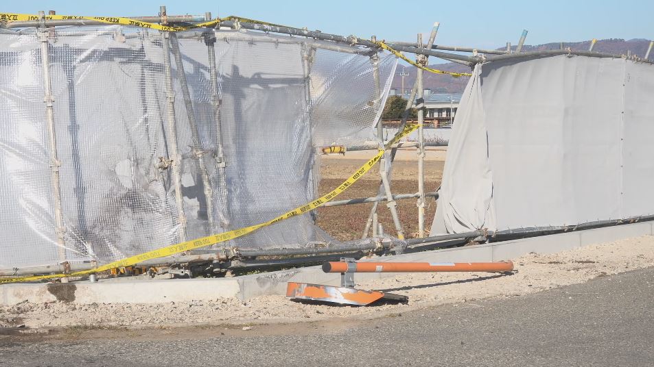 骨組みが曲がったフェンス。そばには倒れたカーブミラーも。