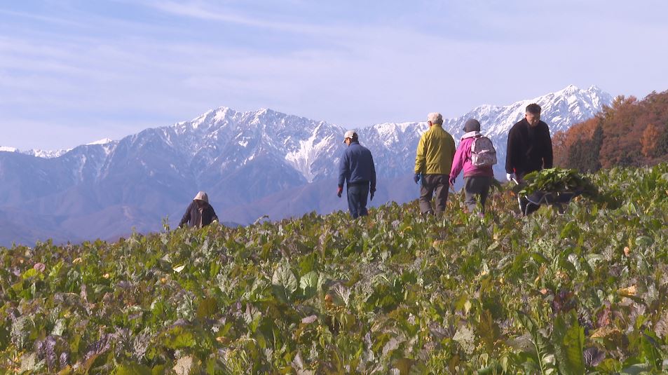 北アルプスを望む長野市中条。野沢菜が収穫の時期を迎え、恒例の「お菜とりツアー」が11月15日から始まりました。