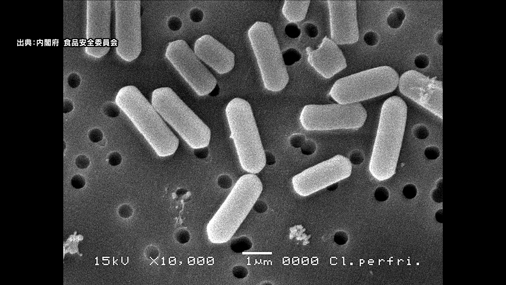 ウエルシュ菌は、ヒトや動物の腸管、土壌など自然界に広く住み着いています。この菌は酸素を好まない(嫌気性)菌で、芽胞(がほう)と呼ばれる胞子のような形態をとることがあり、その状態だと熱や乾燥に非常に強い特徴を持っています。食品を大釜などで大量に加熱調理すると、中心部が無酸素状態になり、芽胞の状態で生き残ったウエルシュ菌が適温になると発芽し、活発に発育を始めます。こうしたウエルシュ菌が多数増殖した食品を人が食べることにより、食中毒を発症します。