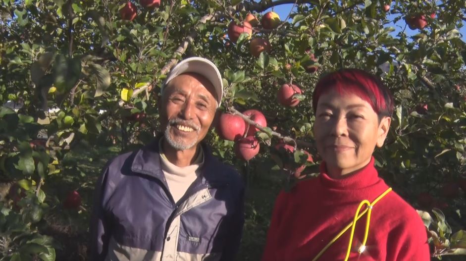 飯島町のリンゴ農園「原田屋」の宮脇寛行さんと明子さん夫婦。今年は比較的順調に育っていますが、2024年は大変な思いをしました。