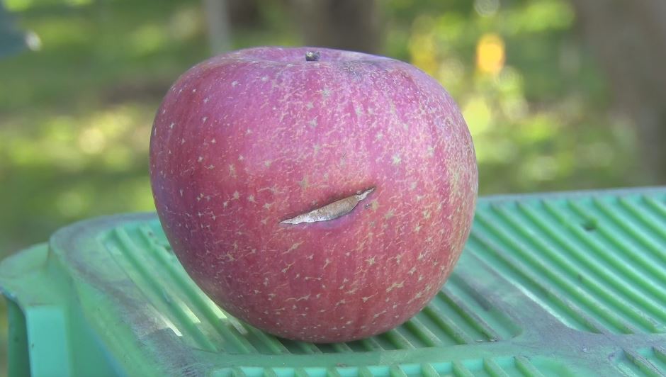 カメムシの被害に遭ったリンゴは「かめふじこ」。