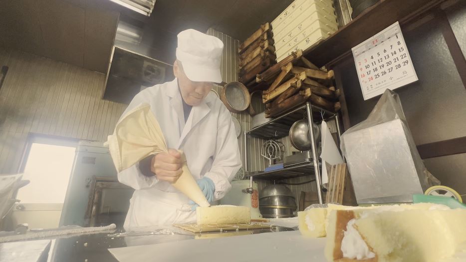 スポンジ生地でバナナと生クリームを包んだ長野県飯山市の冬の名物「バナナボート」。今年も販売が本格化し、市内の菓子店には心待ちにしていた客が訪れています。