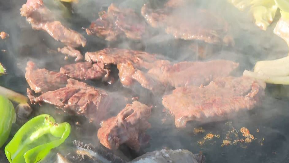 鉄板を囲んで焼き肉を楽しむ人たち。この場所は、飯田市中心部の交差点です。通行止めにして並べた鉄板は36枚。「いい肉の日」に合わせて行われた焼き肉イベントです。