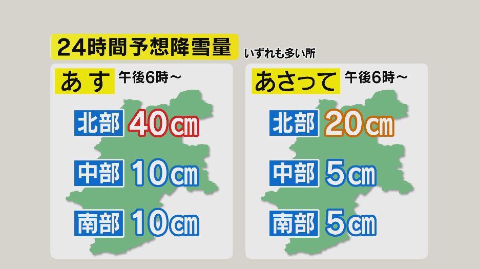 予想降雪量はいずれも多いところで、3日午後6時からの24時間で、北部40センチ、中部と南部10センチ。