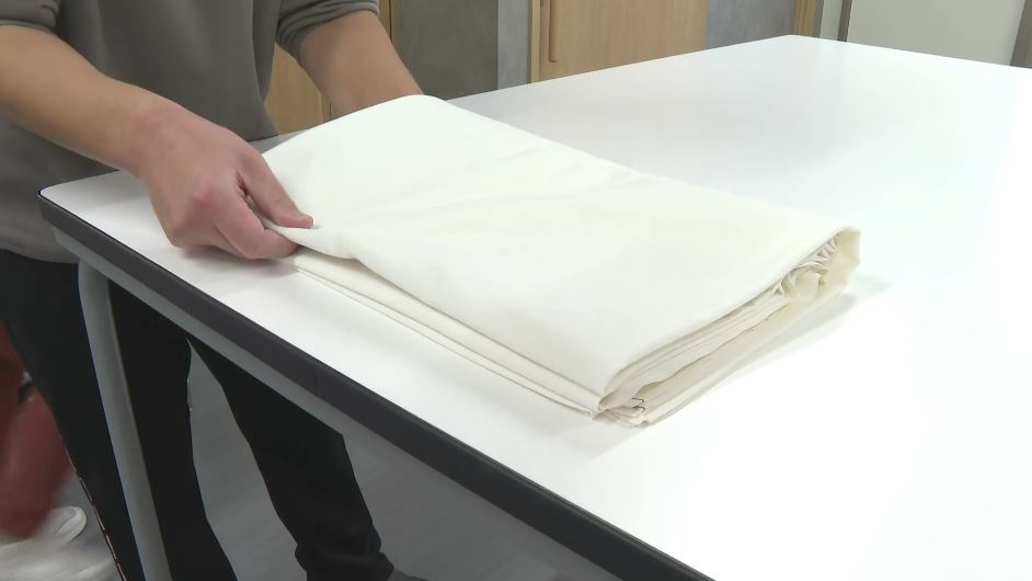 作業所で丁寧にシーツをたたむのは「え~る」の24歳の女性職員。
