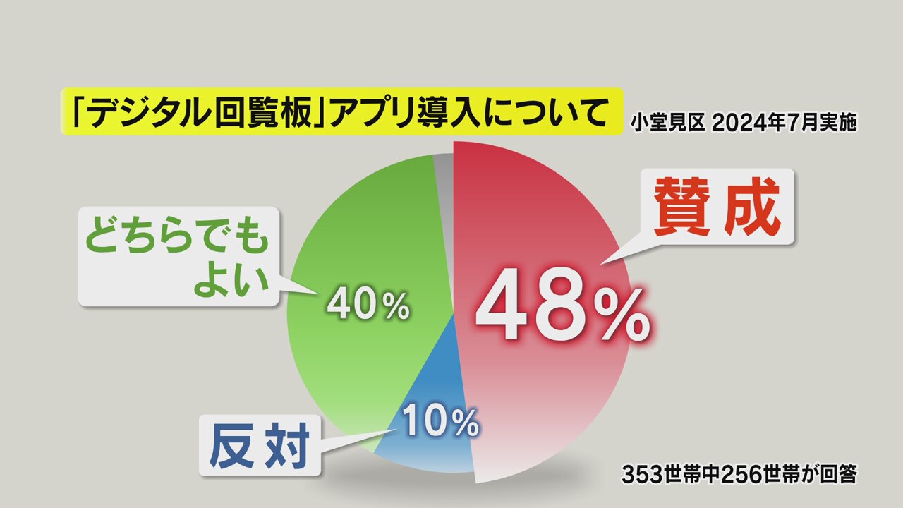 そこで、2024年「デジタル化推進特別委員会」を設置。住民にアンケートを実施したところデジタル回覧板に「賛成」が48%、「反対」は10%、「どちらでもよい」が40%で賛成多数となり、導入を決めました。