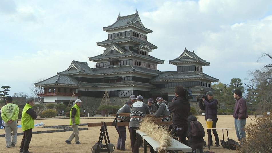長野県松本市の松本城の本丸庭園で正月用のしめ縄づくりが行われました。
