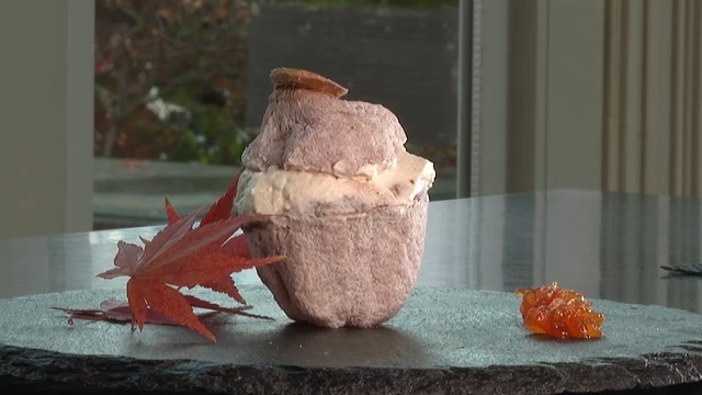 「一番のこだわりは発酵あんこ。60度で8時間発酵させて、砂糖は使っていない。生クリームも砂糖なしで、市田柿の自然の甘味だけ。食べると全体的にバランスよくなるよう作っている。できればガブっと食べてもらうとおいしいと思います」