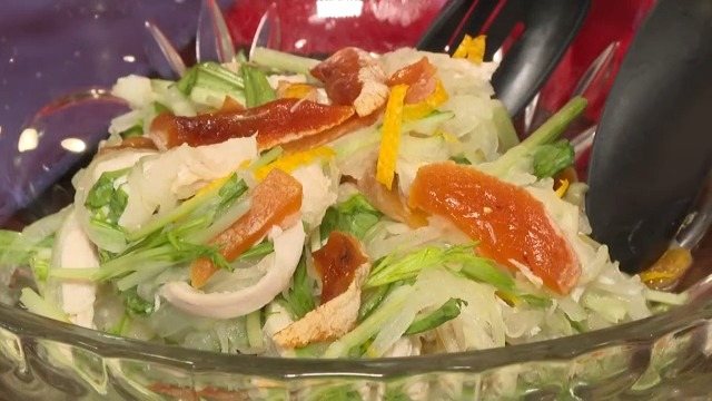 キャンペーン中に並ぶ市田柿の料理は、天ぷらに、角切りにした市田柿を入れたポテトサラダ。タマネギ、水菜、鶏のむね肉と細切りにした市田柿を混ぜ、酢などで味付けたマリネなど。