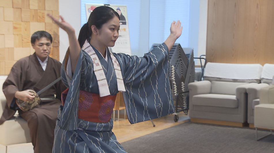 県庁の応接室に響く三線の音色。伝統衣装を身に着けた女性がしなやかに踊ります。