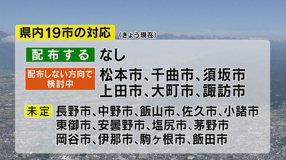 NBSが県内19市に11日現在の状況を電話取材したところ、「おこめ券」を配布すると明言した市はなく、配布しない方向で検討中としたのが、松本市、上田市、諏訪市など6市、残りの13市は「未定」でした。