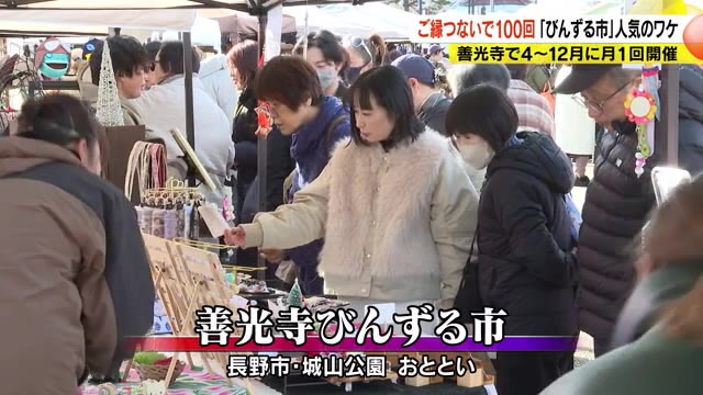 長野市の善光寺境内などで4月から12月にかけて毎月開かれる「善光寺びんずる市」。人と人の縁をつないでにぎわいを生み出そうと13年前にスタートし、このほど、100回目の節目を迎えました。