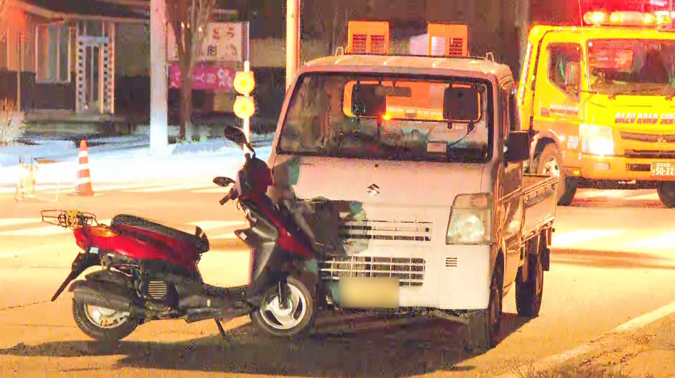 現場は信号機のある交差点で、警察によりますと、右折していた原付バイクと対向車線を直進してきた軽トラックが衝突したとみられ、事故の原因を詳しく調べています。