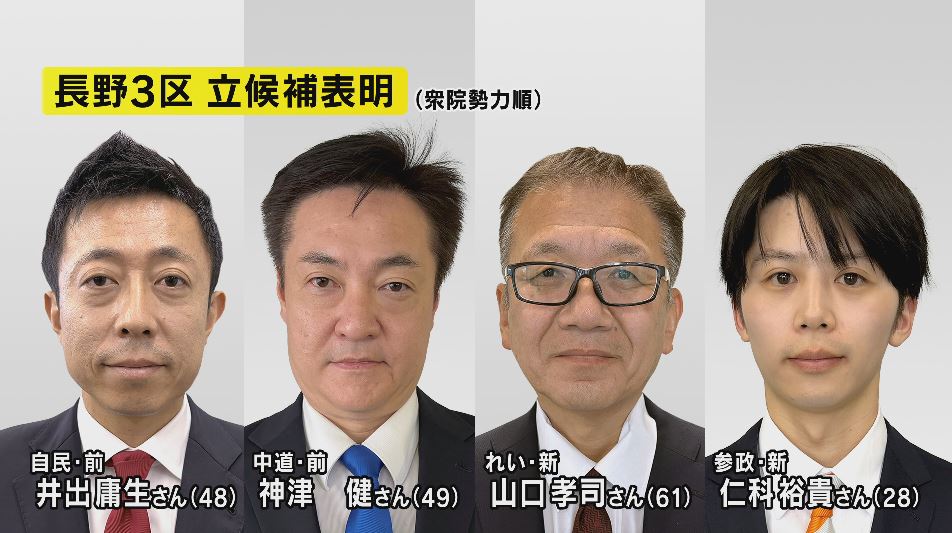 長野3区には、これまでに自民党・前職の井出庸生さん、中道改革連合・前職の神津健さん、れいわ新選組・新人の山口孝司さん、参政党・新人の仁科裕貴さんの4人が立候補を表明しています。