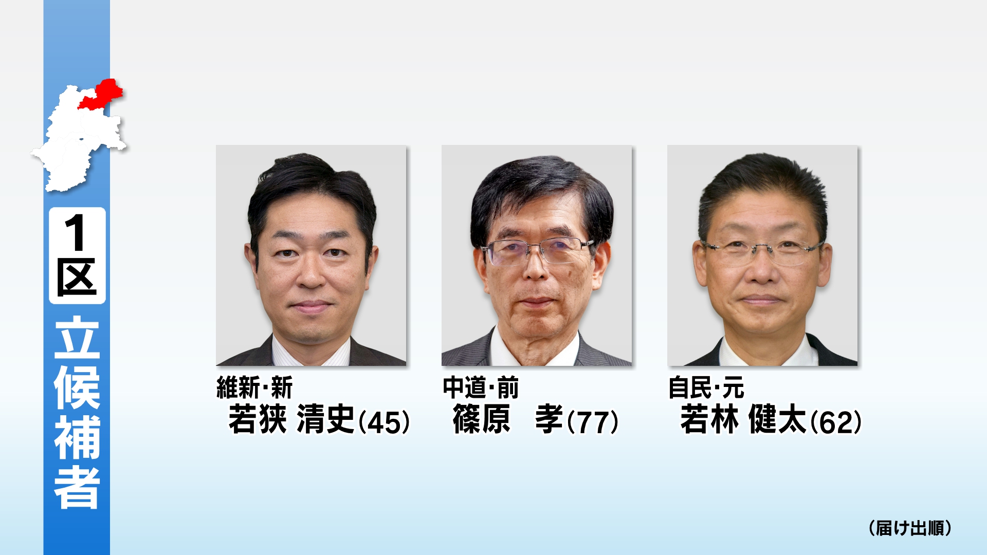 長野1区に立候補したのは届け出順に日本維新の会・新人の若狭清史さん(45)、中道改革連合・前職の篠原孝さん(77)、自民党・元職の若林健太さん(62)の3人です。