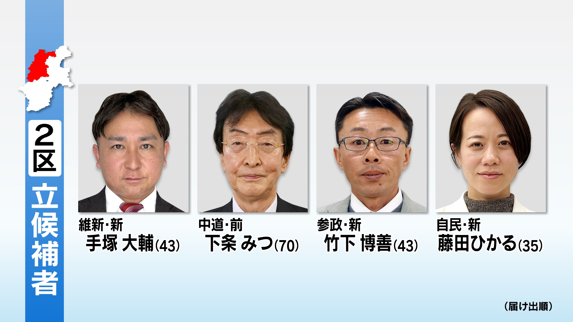 長野2区に立候補したのは届け出順に、日本維新の会・新人の手塚大輔さん(43)。中道改革連合・前職の下条みつさん(70)。参政党・新人の竹下博善さん(43)。自民党・新人の藤田ひかるさん(35)の4人です。