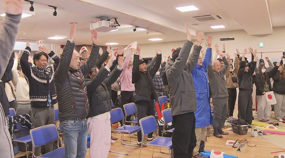 「時刻は午前3時ですが、地元・野沢温泉村では多くの住民が集まり声援を送っています」