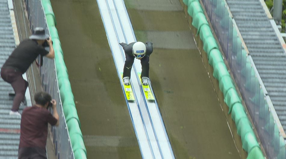 1回目、丸山選手は97メートルを飛び3位につけます。