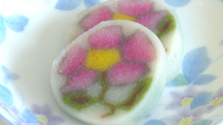 細長く丸めた生地を切り分けると、ピンクと赤が鮮やかな「山茶花(さざんか)」の模様に、県のPRキャラクター「アルクマ」も。