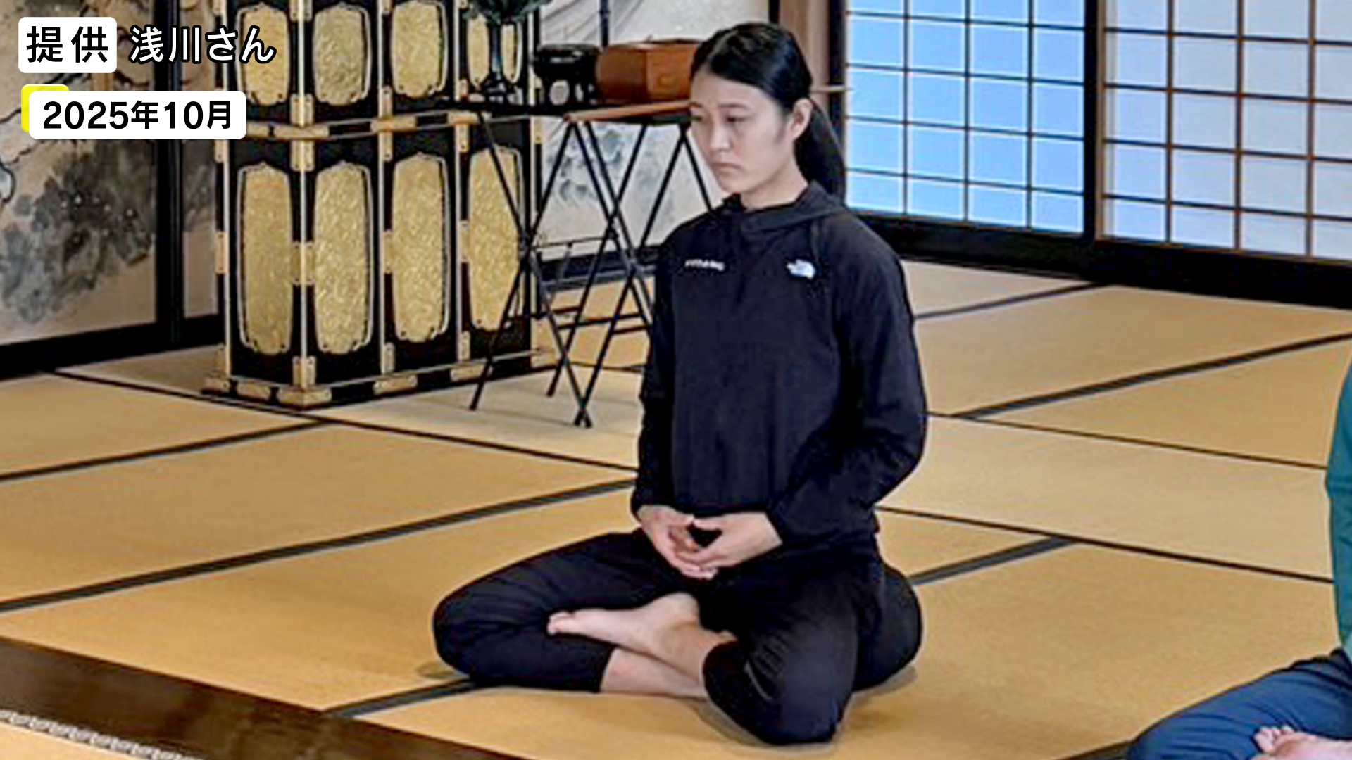 座禅を組む丸山希選手 提供:浅川さん