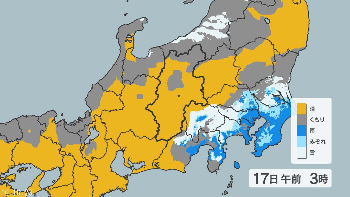 気圧の谷や上空の寒気の影響で、東京地方では17日明け方にかけて雪や雨が降り、多摩地方の山沿いや山地を中心に平地でも積雪となる所がある見込みだということです。23区では積雪とはならない見込みですが、予想より地上気温が低くなった場合や、降水量が多くなった場合には、23区でも積雪となる可能性があるということです。