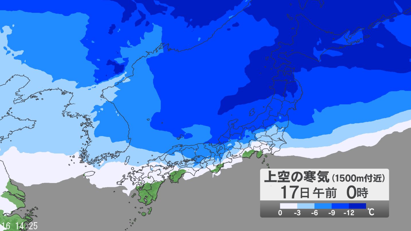 日本付近は、17日はじめにかけて、西高東低の気圧配置となる見込みです。また、関東地方南部から伊豆諸島付近は気圧の谷となる見込みだということです。