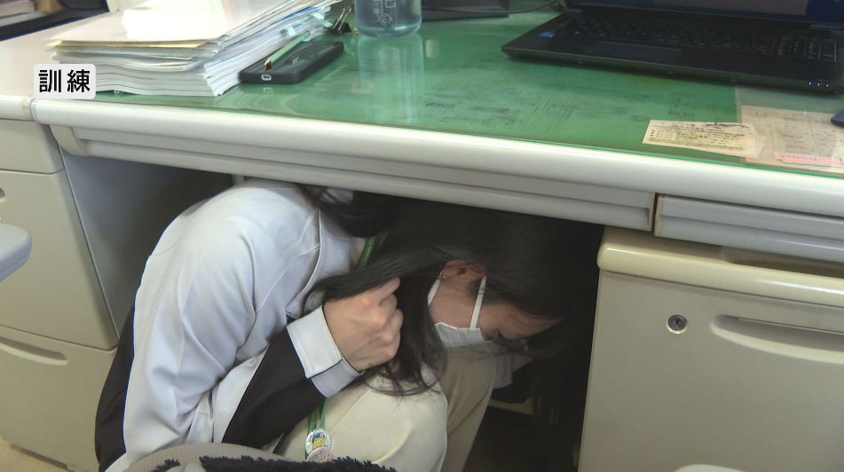 アナウンスに合わせて机の下に身を隠す松本市役所の職員。