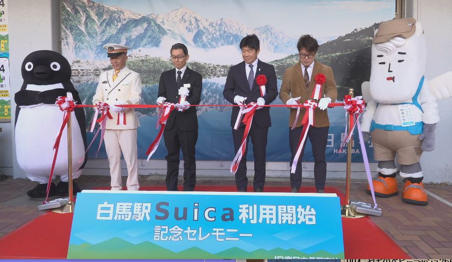 JR白馬駅で行われたセレモニーには、イメージキャラクターの白と黒の「Suicaのペンギン」も登場して愛嬌を振りまき、利用開始を祝いました。