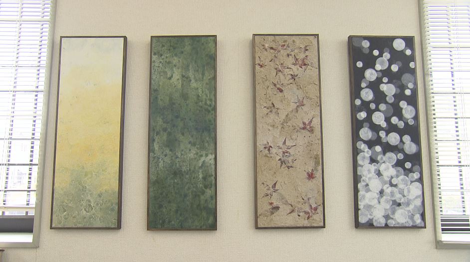 平田さんが和紙で作った作品です。色染めした和紙を何度もすいて重ねていき、落ち葉や土も混ぜて芸術的に仕上げました。