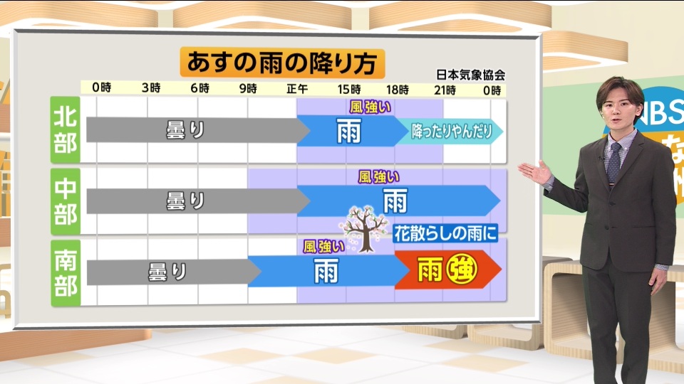 「4月4日土曜日はあいにくの天気となりそうです。昼前に南部から雨が降り始めて、昼過ぎには全県で雨の予想です。夜には雨脚が強まるでしょう。木曽地域や下伊那地域ではザーっと音を立てて降る強さになる予想です。風も強まって、南部では『花散らしの雨』となりそうです。