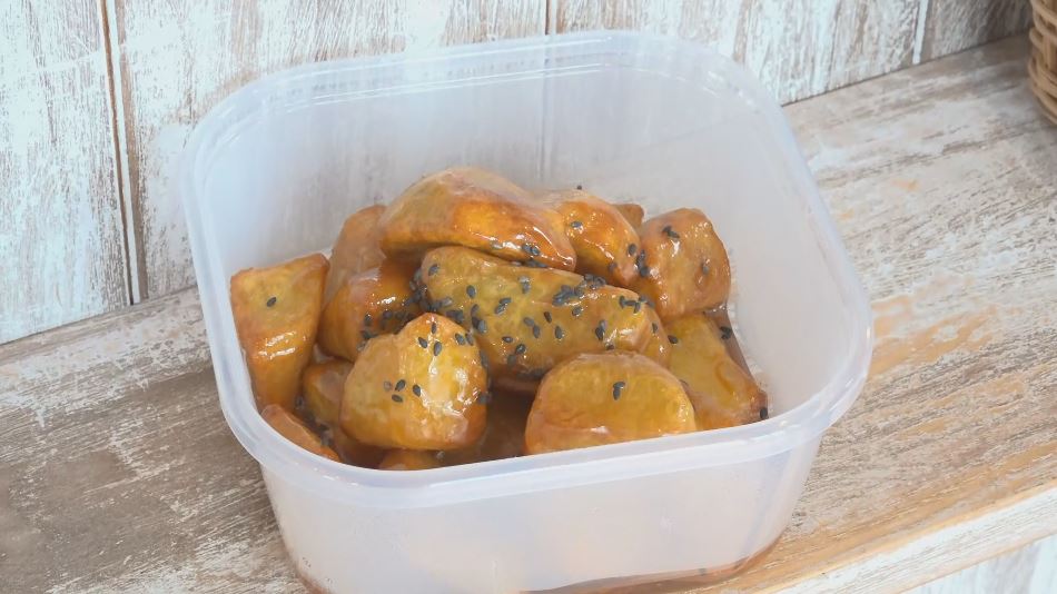 安曇野市のさつまいもスイーツ専門店「おいも日和」。揚げたてのさつまいもに、たっぷりの蜜を絡めて、人気商品「蜜大学芋」の完成です。